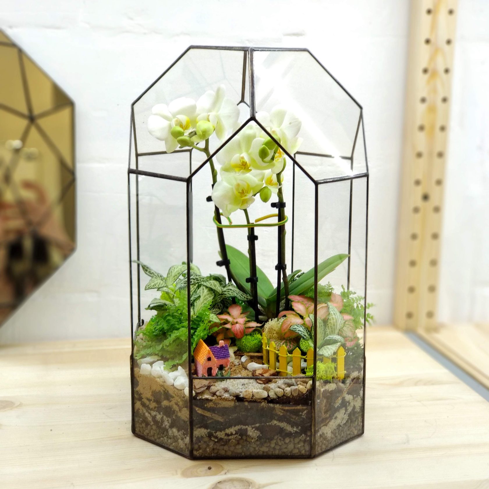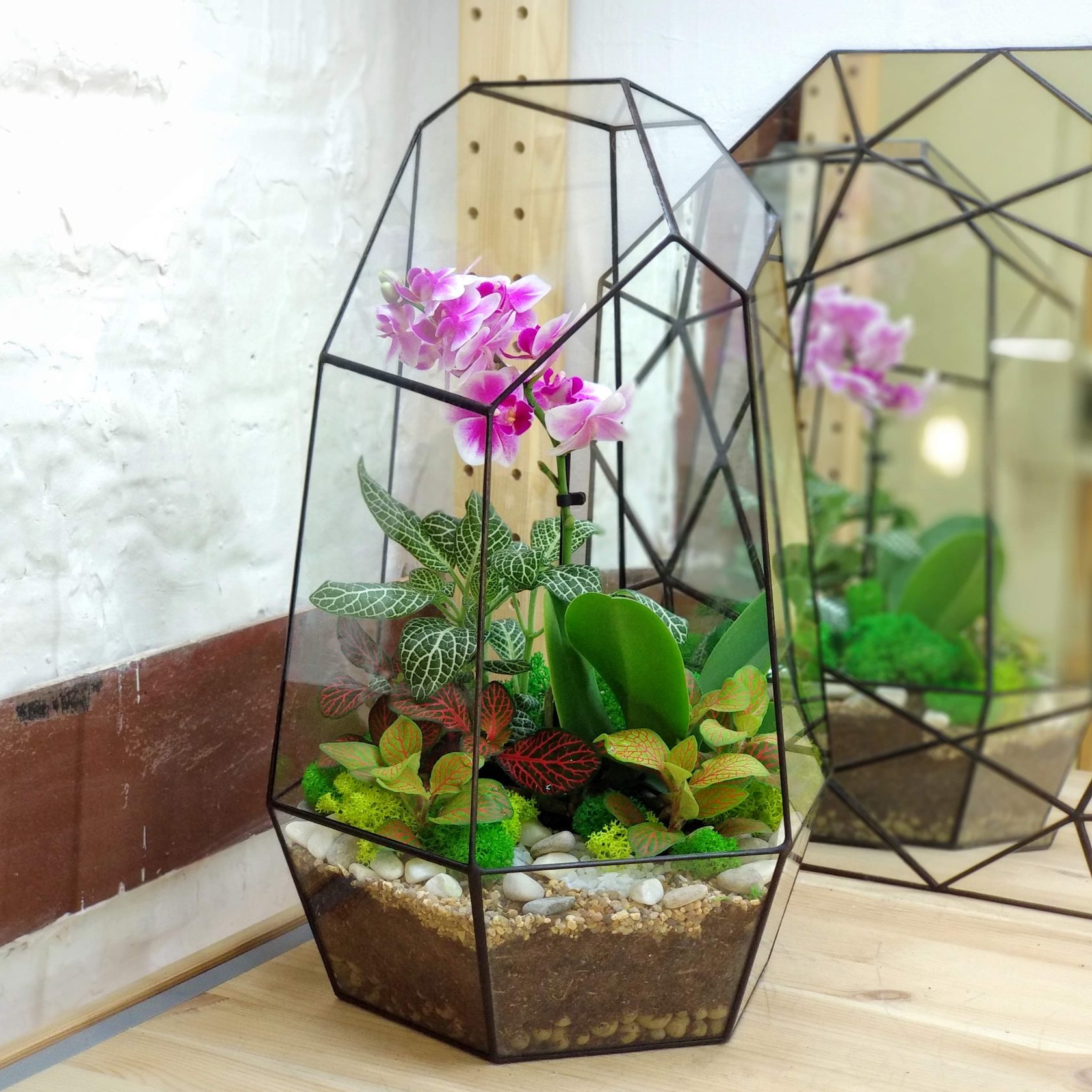 Флорариумы и орхидариумы нашего производства – это полностью ручная работа: начиная с нарезки стёкол, заканчивая оформлением цветочных композиций. Да, вазы для флорариумов мы тоже делаем сами. Помогает нам в этом витражная техника «Тиффани» – способ изготовления объемных форм из стекла и металла.