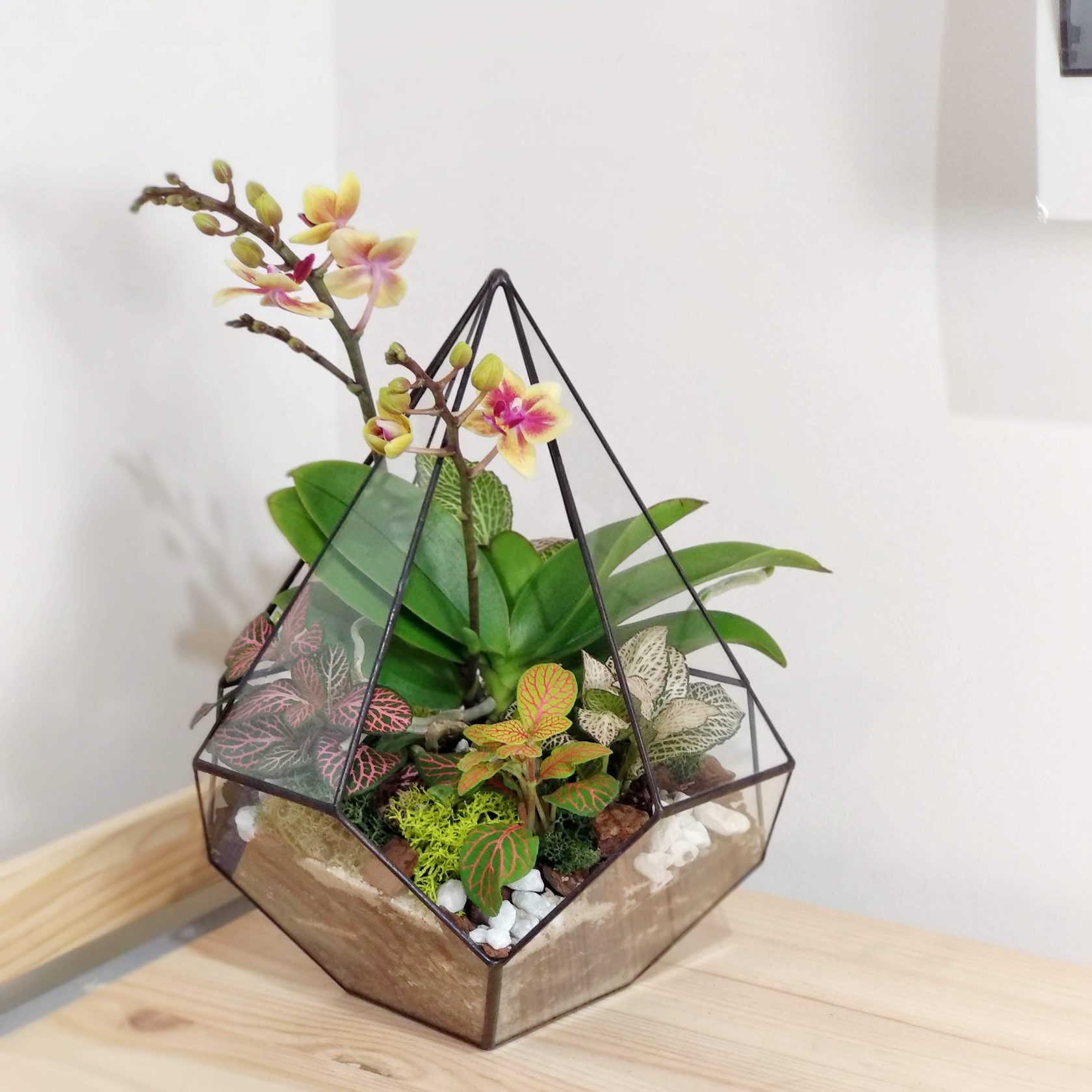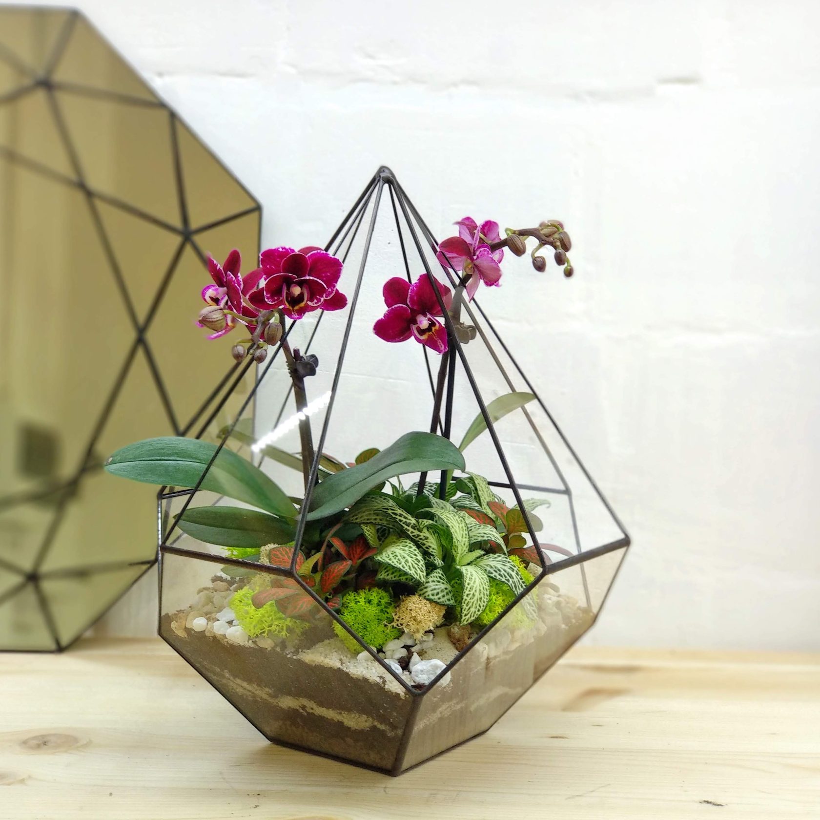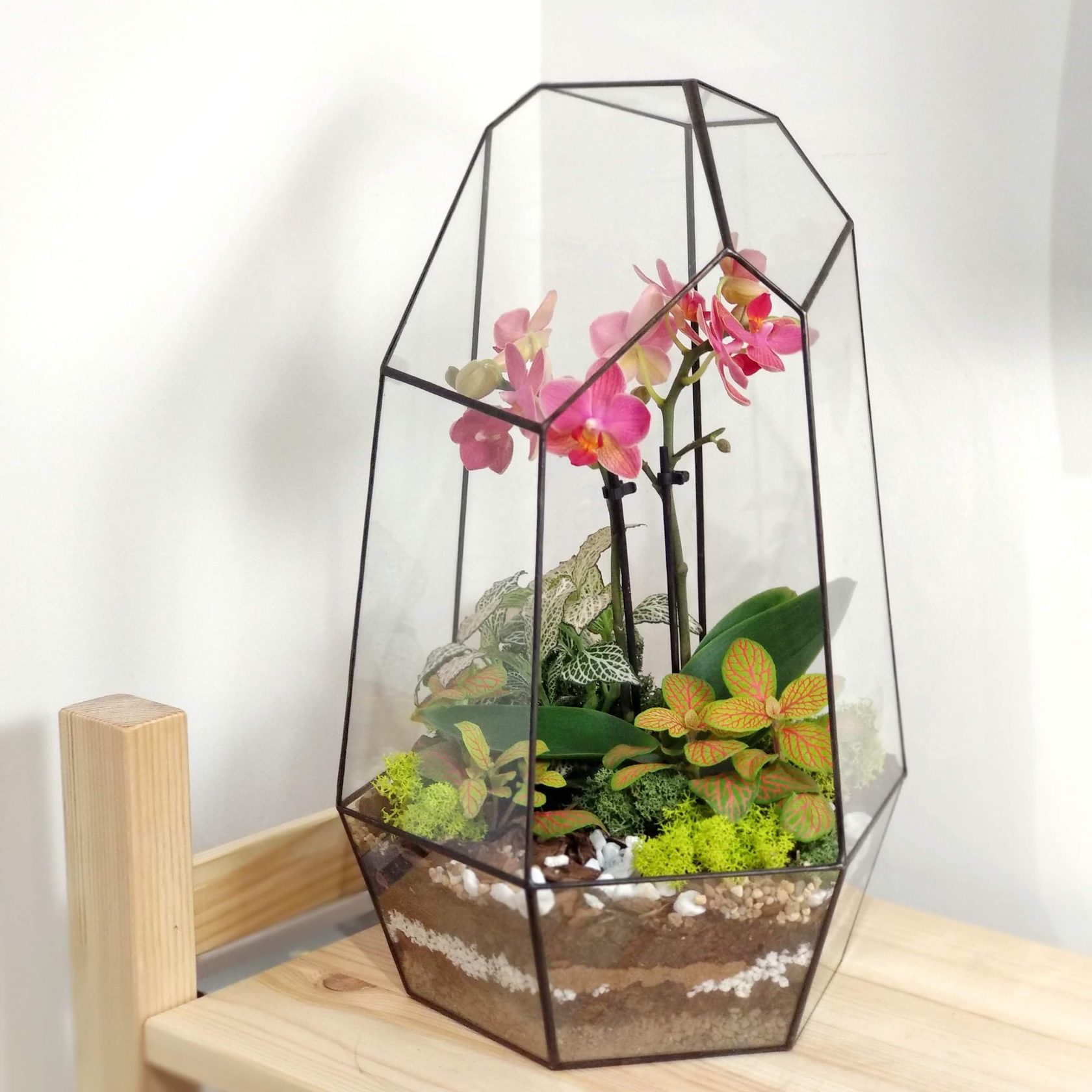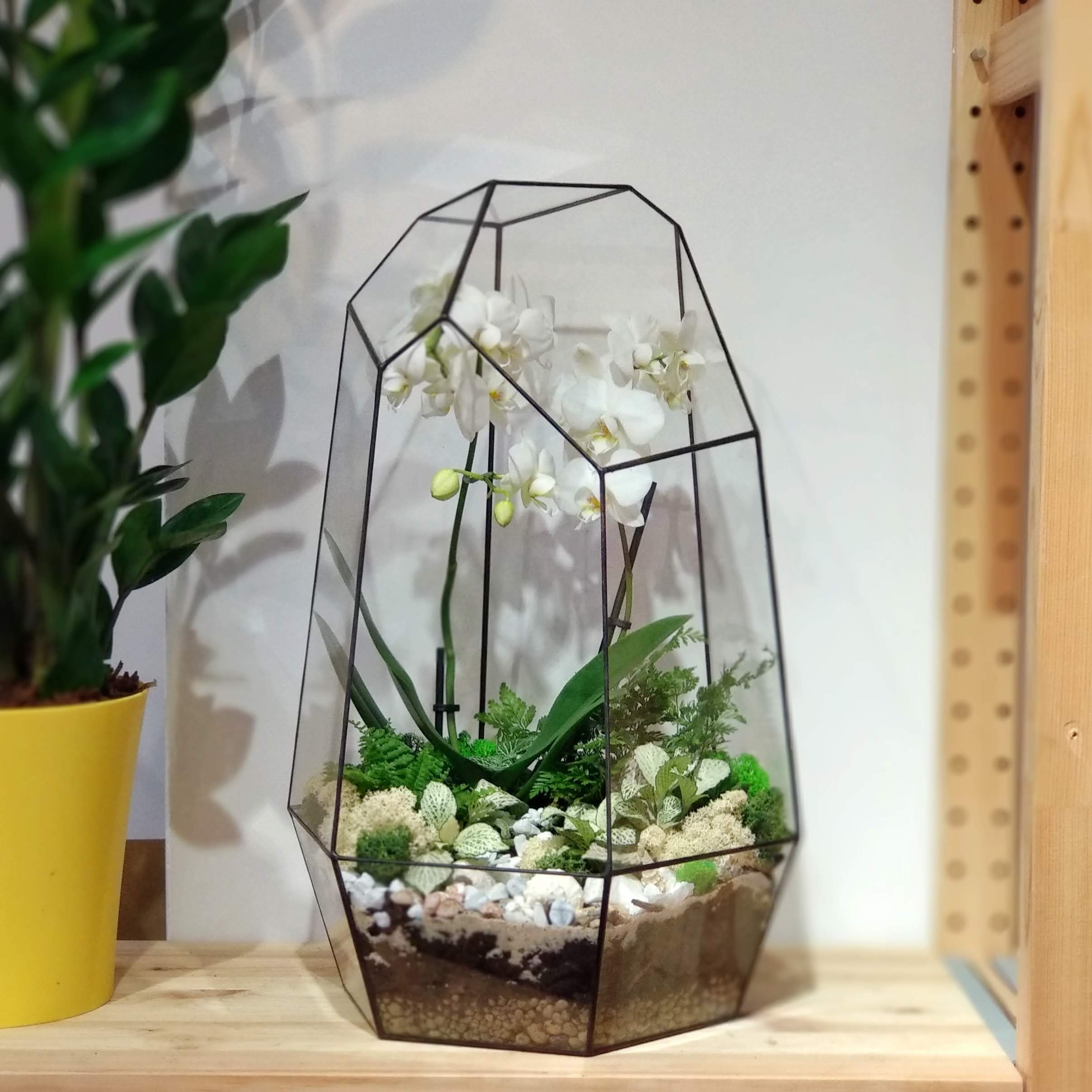 Орхидариум в такой форме отлично впишется в любой интерьер, подчеркнет изысканность гостиной, переговорной комнаты или украсит обеденный стол.